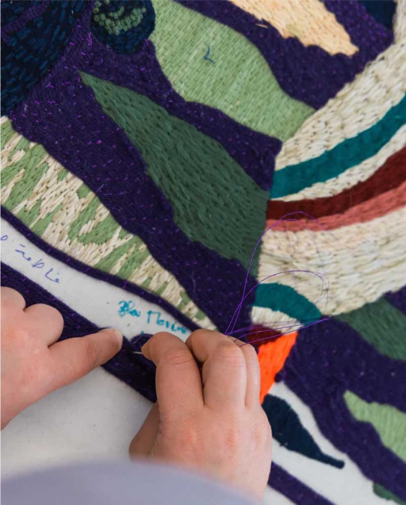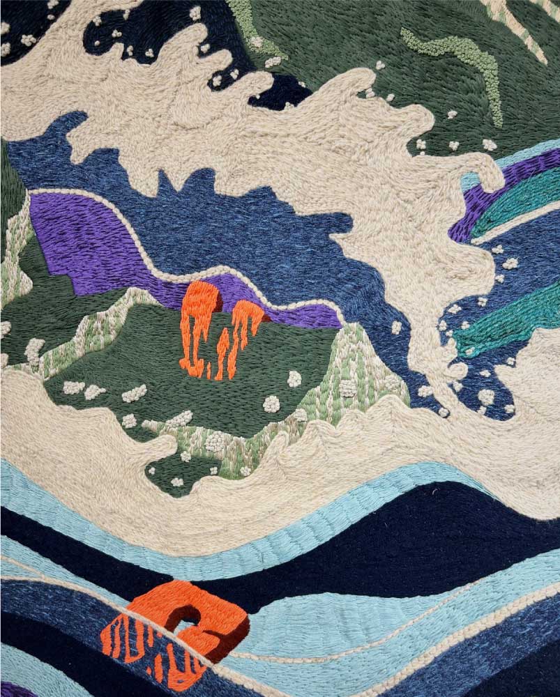 Metallic threads, Silk, Sisal, Wool, Cashmere, Cotton, and Raffia embroidered on canvas.