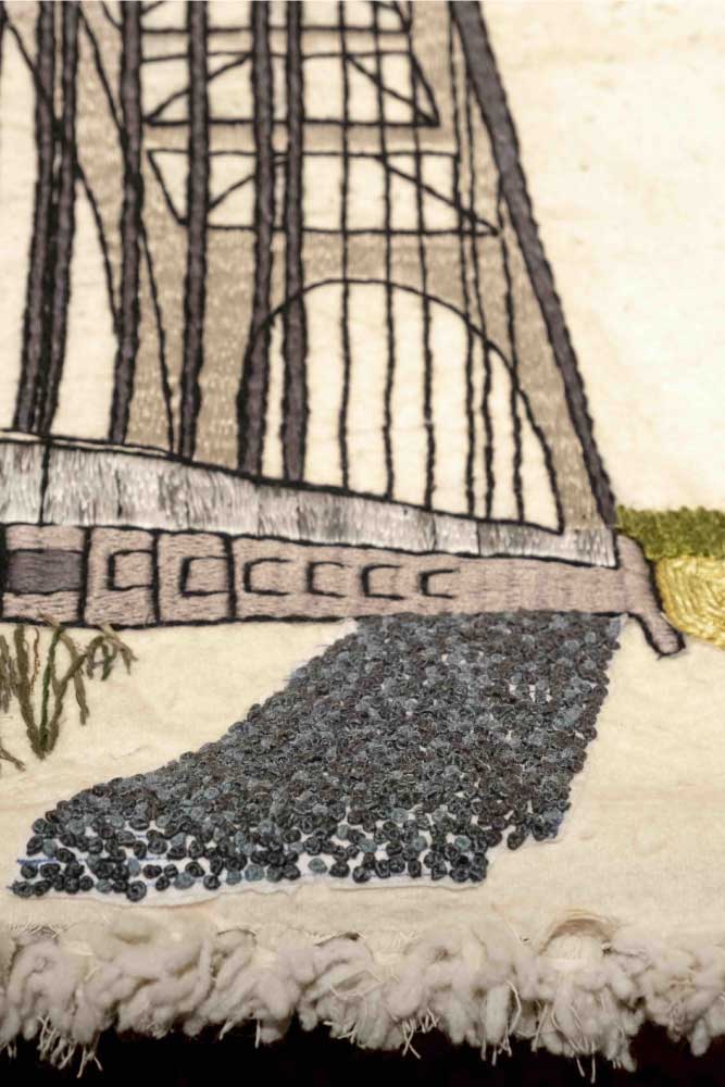 Three embroidered illustrations, part of Mbarki’s installation at Hirafen Expo 2023. Wool on Wool Embroidery.